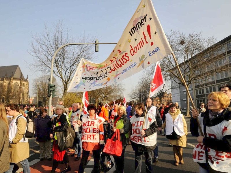 Nach Angaben der Gewerkschaft Verdi nahmen zwischen 10.000 und 15.000 Beschäftigte des öffentlichen Dienstes an der zentralen Kundgebung auf dem Burgplatz vor dem Rathaus in Duisburg teil. Sie fordern 6.6 % mehr Lohn oder mindestens 200 Euro monatlich.