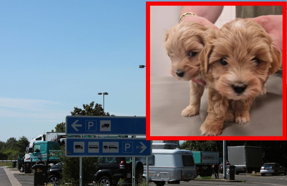 Dramatische Szenen auf dem A1-Rastplatz Hasenkämpe in NRW. Eine Autofahrerin hat am Sonntag (22. September) gegen 14 Uhr bei ihrem Halt zwischen Werne und Ascheberg zwei kleine Hunde-Welpen entdeckt.