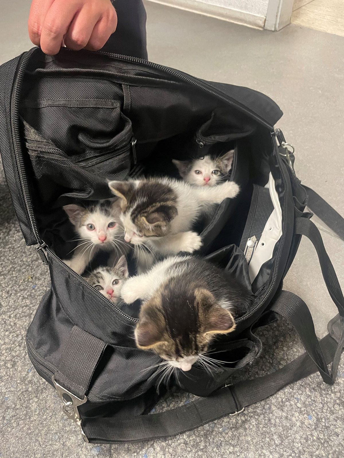 Den Beamten gelang es, die zwei übrigen Samtpfötchen „dingfest“ zu machen, wie es jetzt in einer Mitteilung der Polizei heißt. In einer Einsatztasche wurden die flüchtigen Katzenbabys zur Polizeiwache transportiert. Eine Aufnahme belegt den flauschigen Fund der Ermittler.