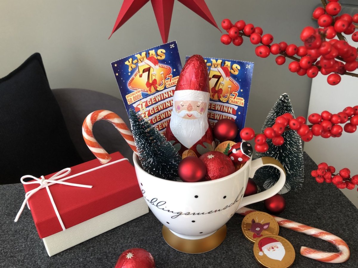 Kleiner Aufwand, große Freude: Mit Rubbellosen wie X-MAS 7, Viel Glück Weihnachten und Weihnachtslosen lassen sich kleine persönliche Präsente schaffen – beispielsweise aus einer Tasse, Schokolade und etwas Dekomaterial. Der Aufwand ist nicht groß, die Freude aber umso mehr. Die Lose sind in vielen WestLotto-Annahmestellen zu bekommen.