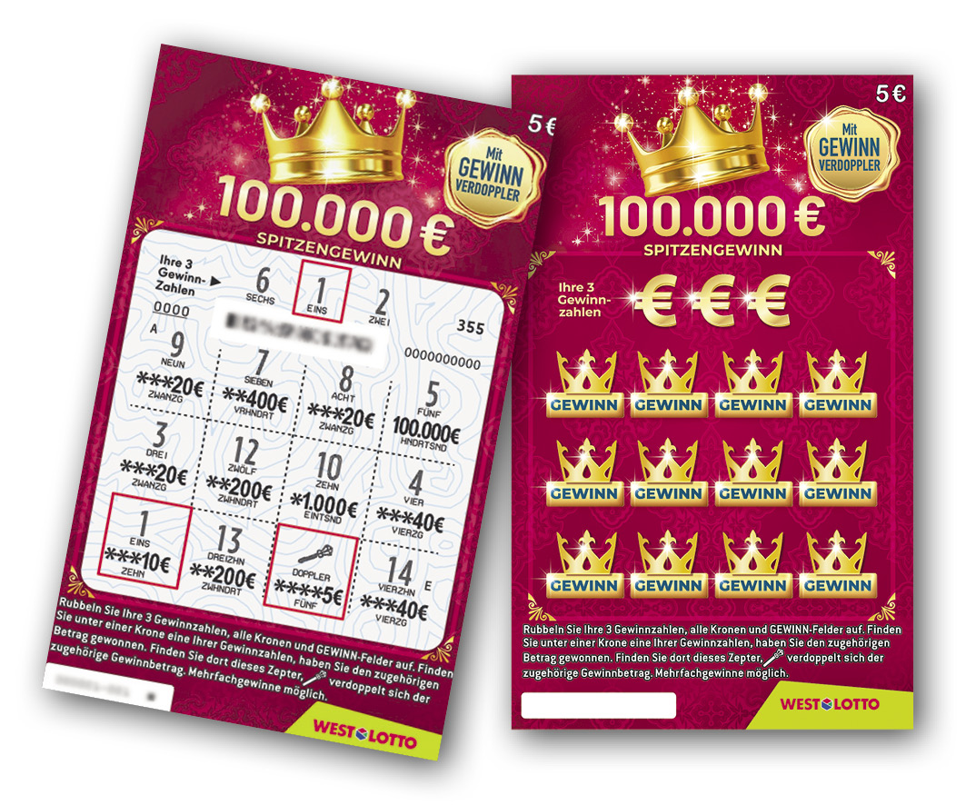 Königlicher Rubbelspaß: Der stellt sich beim WestLotto-Rubbellos „Krone“ von ganz allein ein. Und erst recht, wenn der Spitzengewinn in Höhe von 100.000 Euro freigelegt worden ist (Chance 1:750.000) – dafür gibt es immerhin jeweils zwölf Chancen. So funktioniert es: Rubbeln Sie das Feld „Ihre 3 Gewinnzahlen“ sowie alle Kronen und GEWINN-Felder auf. Finden Sie unter einer Krone eine Ihrer Gewinnzahlen, haben Sie den dazu gehörenden Betrag gewonnen. Finden Sie dort ein Zepter, verdoppelt sich dieser Betrag sogar. Mehrfachgewinne je Los sind möglich.
