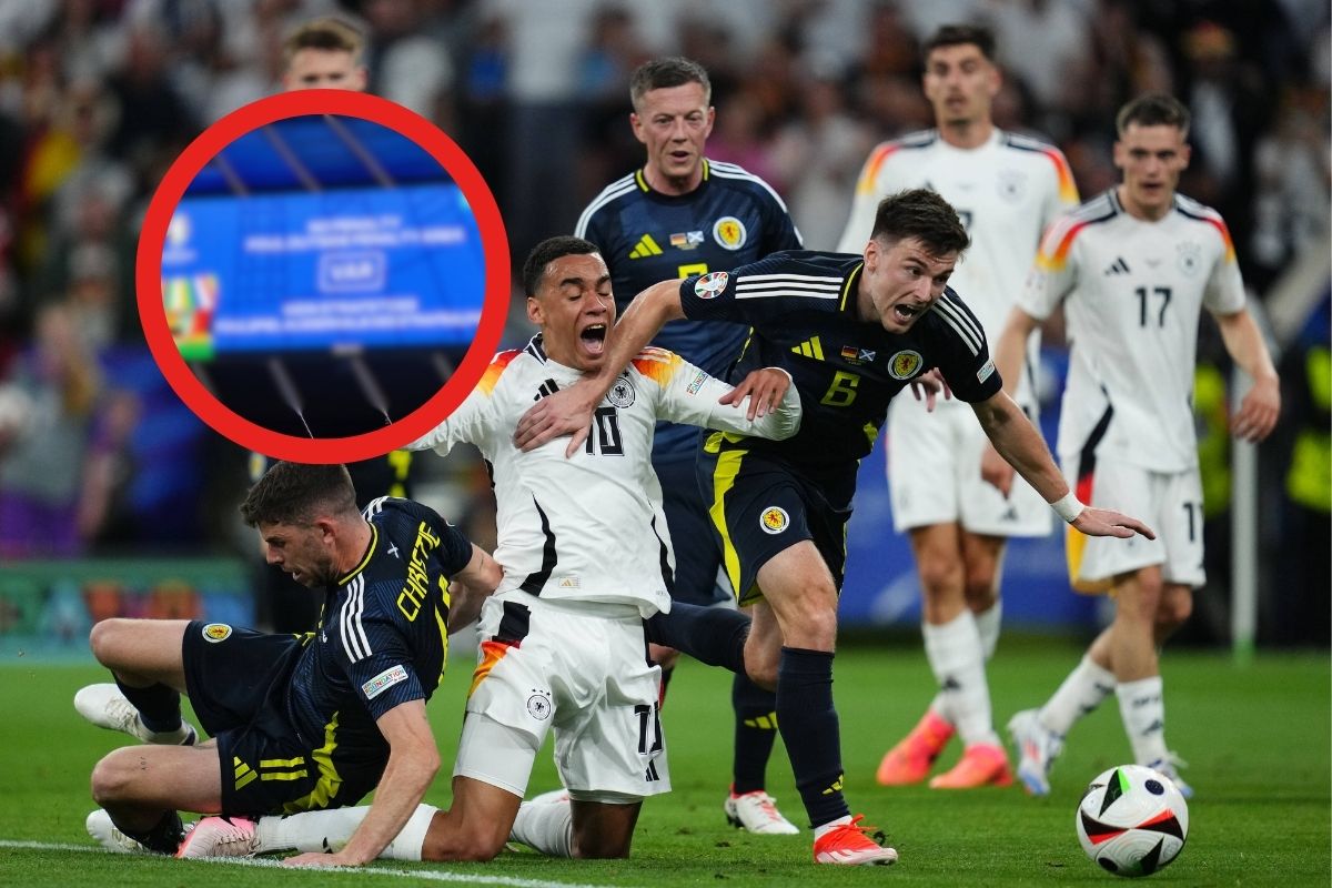 Diese UEFA-Änderung ist ganz besonders. In den europäischen Ligen ist sie noch nicht eingeführt worden, bei Deutschland – Schottland gab es dann das Novum. Es lief die 25. Minute. Mittelstädt passte von links scharf in die Mitte, wo Musiala gegen Christie und Tierney zu Boden geht. Schiedsrichter Clement Turpin zeigte direkt auf den Punkt.