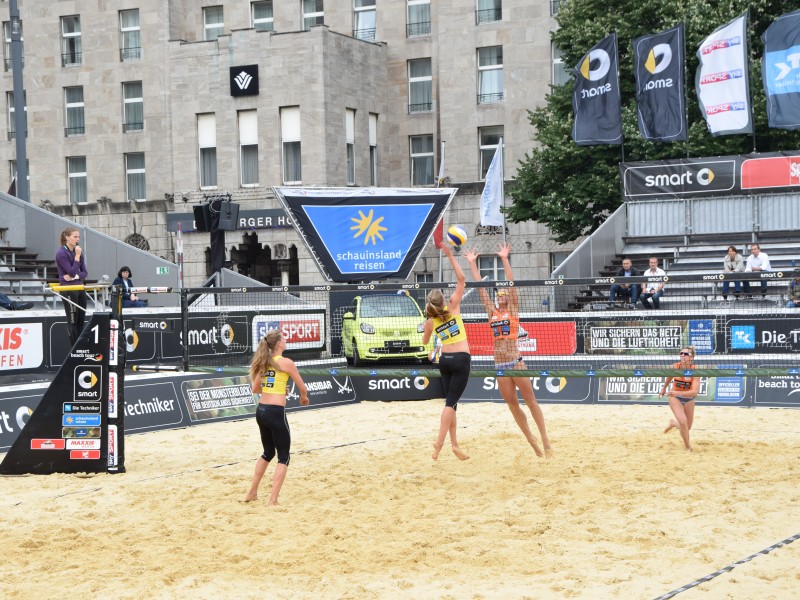 Der Smart Beach Cup läuft seit dem Freitagmittag in der Innenstadt in Duisburg. Durchtrainierte Bodys in knappen Höschen locken die Zuschauer auf die Ränge. Doch die Sonne lässt sich noch etwas bitten.Bei 22 Grad begann das Turnier vor dem Duisburger Theater in der Innenstadt. Rund um das Theater tummeln sich durchtrainierte Beachvolleyballer. Sie trainieren auf den Rasen-Hochgärten vor dem Theater und streifen sich kurz vor dem Spiel noch ihr Turnier-Leibchen über.